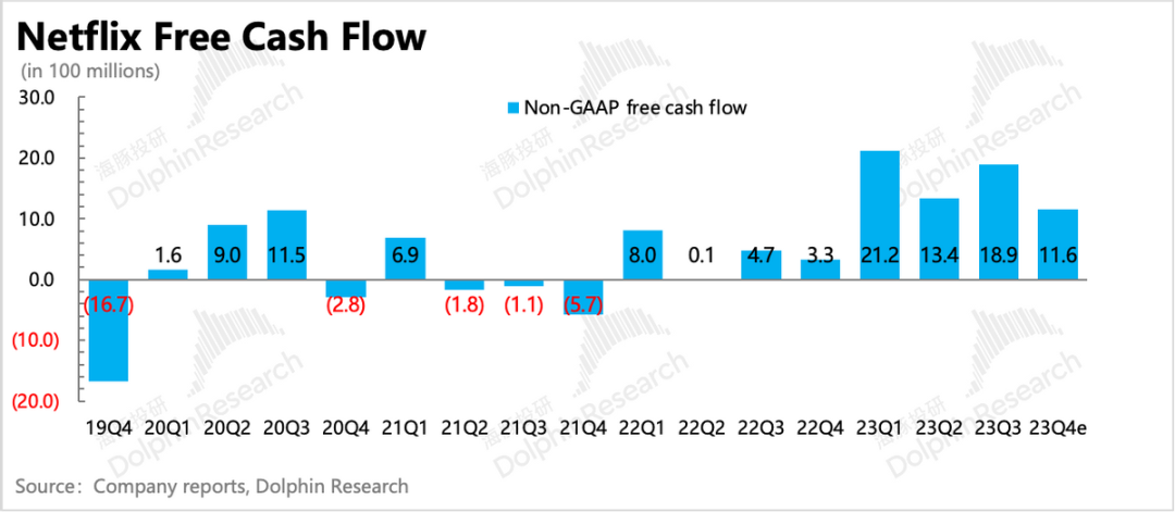 奈飞四季度实现经营利润14.96亿,同比大幅增加172%。不过这里面包含了因为罢工影响导致的投入产出错配的因素(减少内容排期,摊销成本同比下降)。但也正如海豚君前文所说,能够在当季内容数量逊色往年的情况下,还能吸引新用户并留存从而实现收入的加速增长,足以可见奈飞的历史内容库优势。