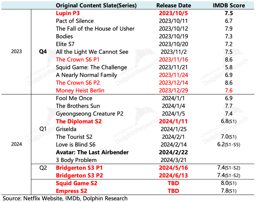 还是海豚君在上季度说的,虽然市场上部分资金的观点对投入增加影响盈利有戒心,但对于进入新一轮内容投资周期,从长远起来看应该积极的看待。当下的投入是为了未来1-2年的内容储备,只要内容储备丰富,优势地位才会更稳固。从目前的pipeline来看,一季度内容淡季,但二季度开始,不乏有《Bridgerton S3》、《Squid Game S2》、《Empress S2》等高分爆剧的续集上线。管理层也在股东信中,表达了对2024年内容储备的信心。海豚君认为,至少在今年大部分时间,奈飞在内容优势上仍然是一个相对从容的状态。