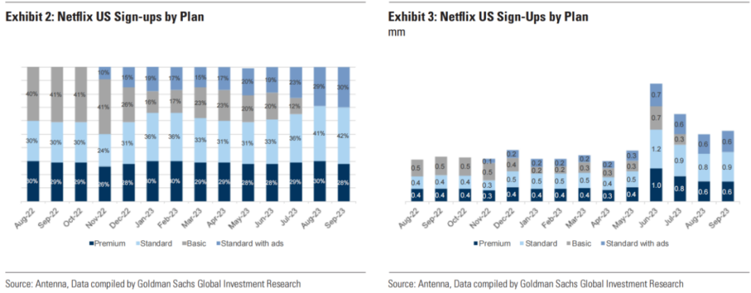 不同于以往的认知,这次欧美地区是增长主力,北美和欧洲分别增加了281万和510万人。海豚君认为,除了打击账户共享的效果外,也与7月以来,奈飞逐步在美国、英国等欧美成熟地区,取消基础套餐来扩大广告套餐覆盖范围有一定关系。广告套餐的推广是2022年底开始推行,5月达到500万,11月达到1500万,近期宣布已经达到了2300万。从第三方数据来看,美国新增注册的用户中,选用广告套餐的用户已经占了30%。