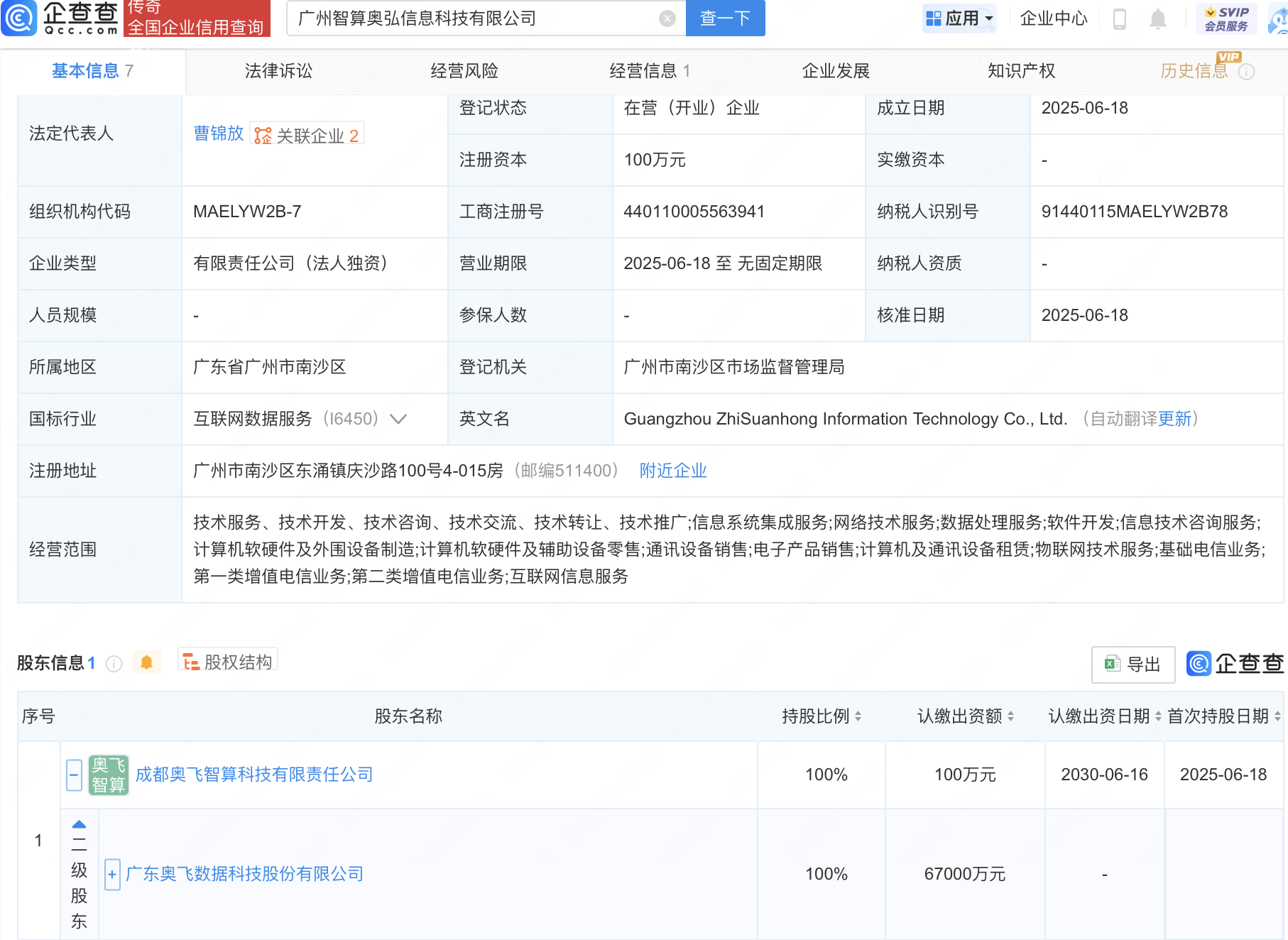 企查查APP显示,近日,广州智算奥弘信息科技有限公司成立,法定代表人为曹锦放,经营范围包含:计算机及通讯设备租赁;物联网技术服务;基础电信业务;第一类增值电信业务等。企查查股权穿透显示,该公司由奥飞数据(300738)间接全资持股。
