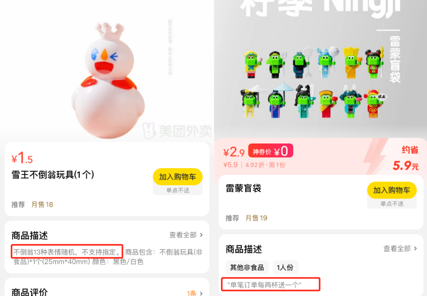 左:蜜雪冰城“雪王不倒翁玩具”;右:柠季“雷蒙盲袋”