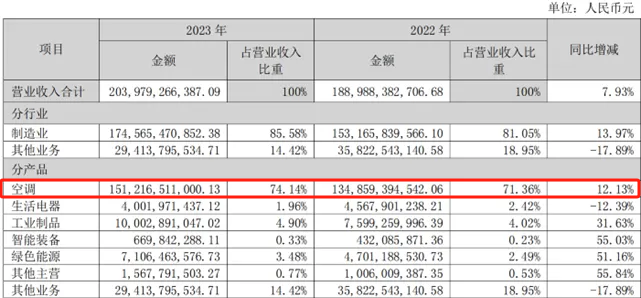 在2023年公司财报看,空调业务在格力的营收占比依旧超过7成以上,新兴业务对公司业绩的贡献相当有限。