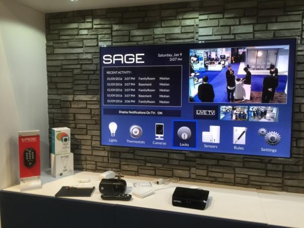 第二个是智能家庭整合商EchoStar 推出的解决方案–SAGE。其实今年在 CES 中,三星和 LG也都有展出它们的智能家居解决方案,不过三星和 LG 的展示实在太像开发商的预售展示屋,只能看却不能动手玩,而 SAGE 的演示可以让你实际操作的。简单说 SAGE 提供了一个整合的平台,加上一个电视盒,用户可以直接从电视上操控家中的门锁、温控器、灯座和插头开关。在 SAGE的规则里,也加入了类似 ifttt 可以自主设定的功能(虽然流程不是很好操作)。和全部用手机操控的家中物联网来说,SAGE 对于长辈是比较亲和的,毕竟长辈对于使用电视摇控器接口“应该”会比手机 App 来的容易。