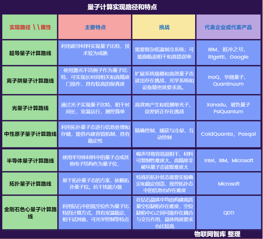 在此前的文章当中,我们介绍了量子计算的原理和特点,目前,量子科技实现的路径如下:超导量子计算路线、离子阱量子计算路线、光量子计算路线、中性原子量子计算路线、半导体量子计算路线、拓扑量子计算路线、金刚石色心量子计算等。每种技术路线都有其独特的优势。下面是我们总结的相关列表: