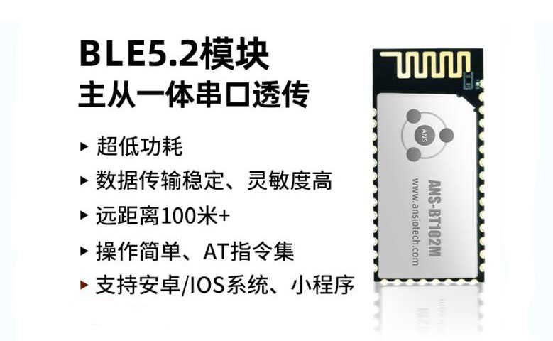 安朔科技自主研发的一款ANS-BT102M低功耗蓝牙模块,产品数据传输稳定,功耗低,远距离,速率高可达60KB/s,支持蓝牙BLE5.2主从一体串口透传,完整的AT指令集、操作简单易上手,能较好的嵌入到看客户产品中,同时满足客户对蓝牙产品再次快速编程需求。