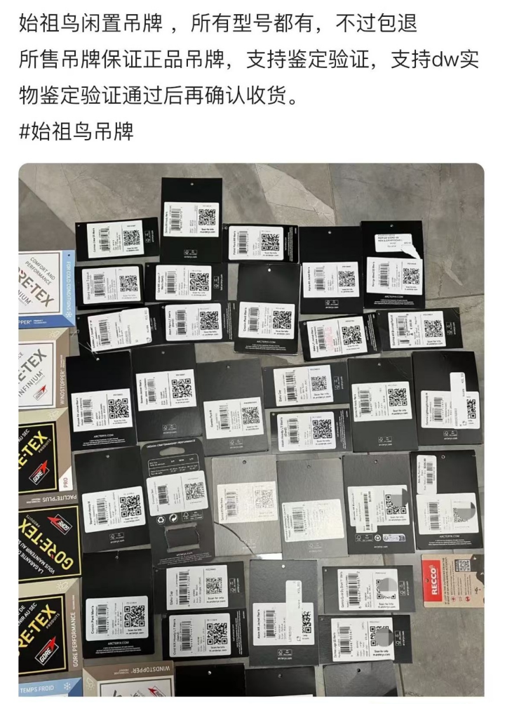 有消息称,不少卖家开始在二手平台上售卖印有“ARC’TERYX”字样的始祖鸟吊牌,一张军鸟吊牌被标价300元,而且不议价。