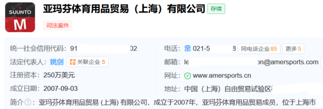 始祖鸟进入国内注册相关的公司为亚玛芬体育用品贸易(上海)有限公司,天眼查显示,该公司成立于2007年9月3日,注册资本为250万美元。