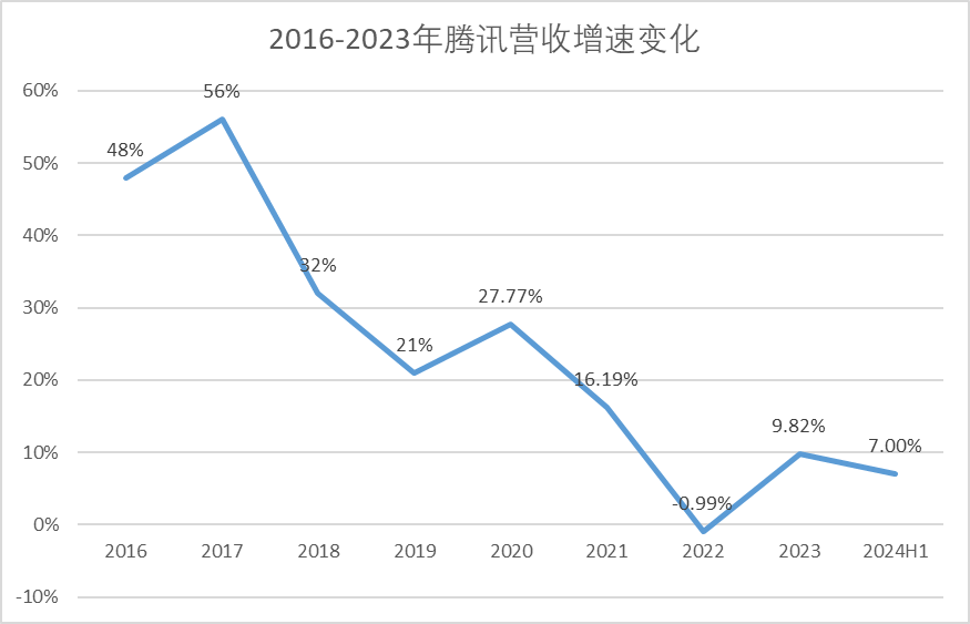 然而,从营收的增速来看,腾讯的营收增速却在逐渐走低。从2016—2017年时的50%左右下滑至了如今的10%以内。
