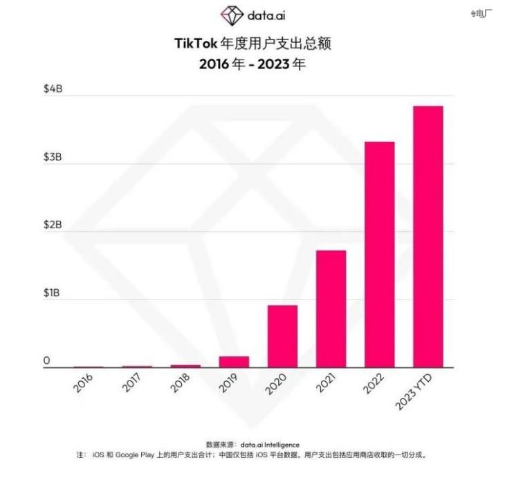 据移动数据调研机构data.ai报告,TikTok在2023年的全球市场的用户消费支出超过38亿美元,同时累计年度用户支出超过100亿美元,成为唯一一个达成此成就的非游戏类App。足以见得TikTok在海外市场的吸金能力之强。