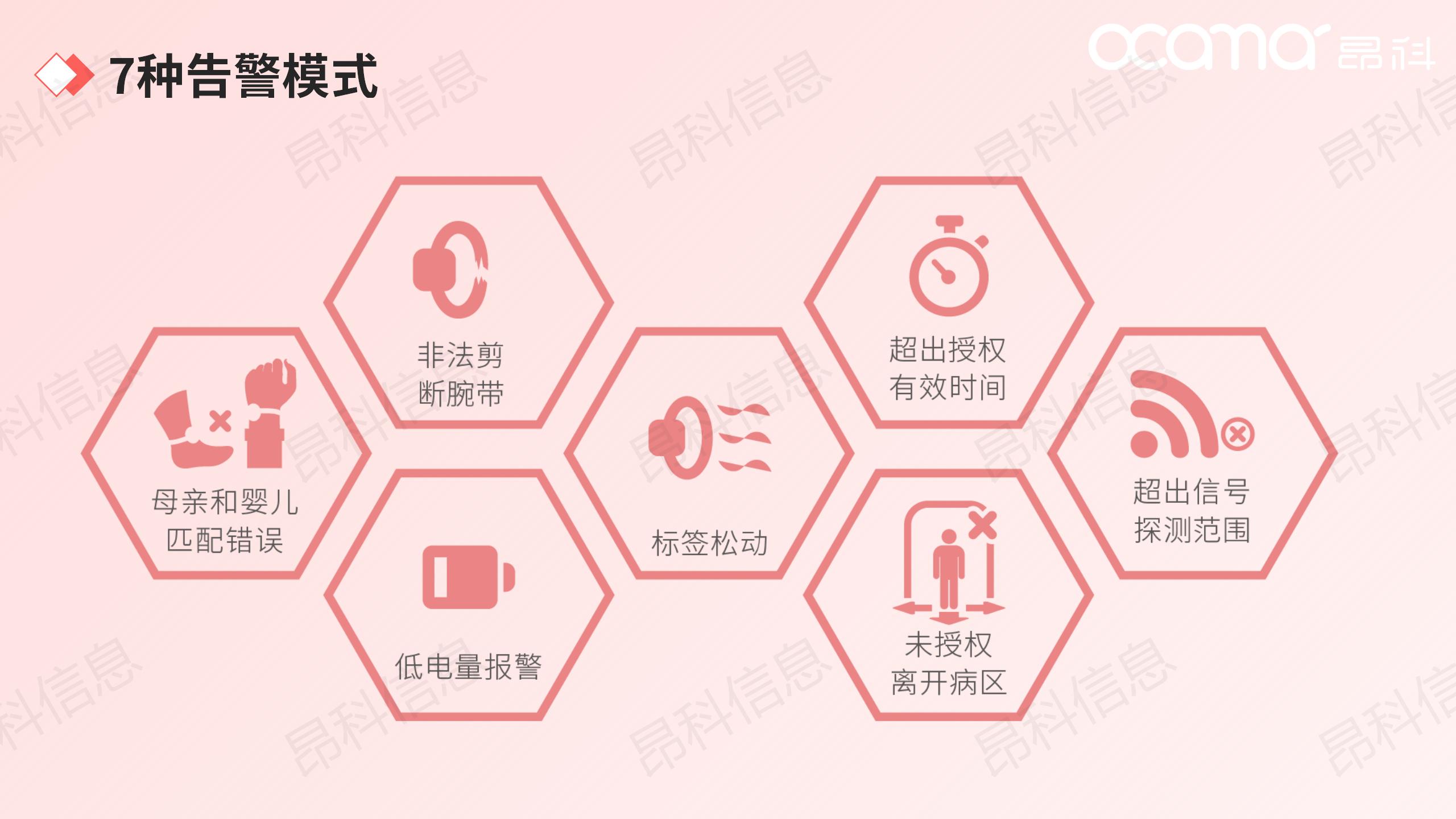 昂科婴儿防盗系统提供7 种智能告警模式,覆盖拆带、越界、错配、低电量、离线、非授权抱离、异常移动等全场景风险,24 小时不间断监测,不漏判、不误报。