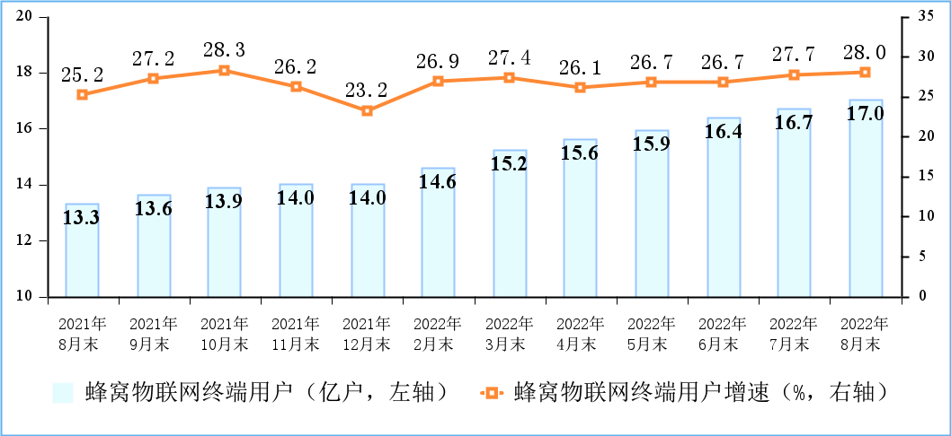 9月20日,工信部公布了最新的《2022年1-8月份通信业经济运行情况》报告,通信业良好运行态势依旧喜人。值得注意的是,截止8月末,三家基础电信运营企业发展蜂窝物联网终端用户达到16.98亿户,对比移动电话用户总数16.78亿户,国内蜂窝物联网产业首次迎来“物超人”这一历史性时刻。