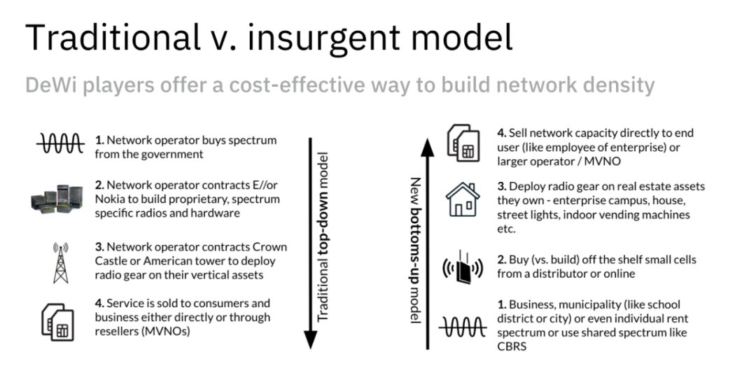 DeWi项目翻转了传统电信商业模式的脚本,如上图所示,DeWi不需要购买昂贵的频谱、承包专有设备和进行昂贵的安装,而是自下而上地工作。他们利用非授权频段,使用现成的组件,并依靠个人在家中安装设备。