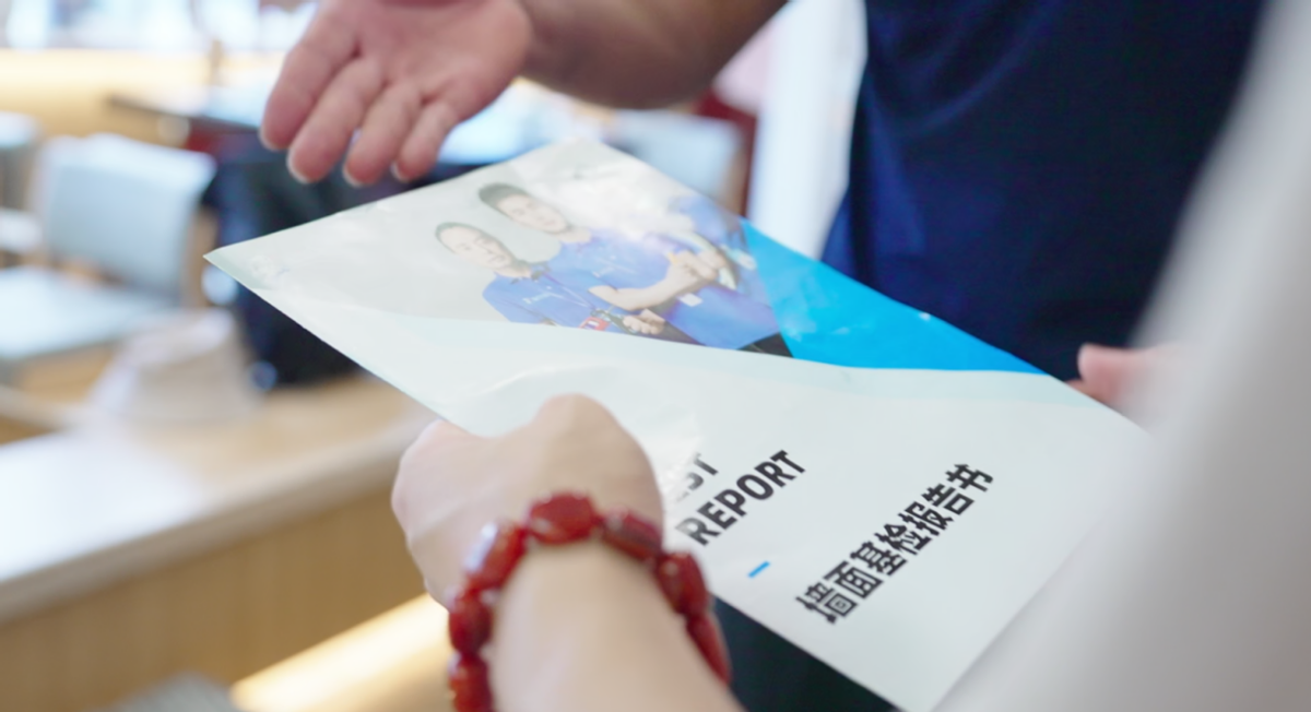 工程师给用户展示墙面基检报告书(图源:家修匠人)