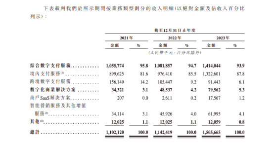 首先,从富友支付的核心业务——综合数字支付服务来看, 2023年实现了14.14亿元的收入,占总收入的93.9。这其中,绝大部分依赖于境内支付业务,达到13.22亿元,占比87.8%。跨境数字支付服务仅贡献了0.91亿元,占比6.1%。在跨境支付需求激增的背景下,富有支付还需补足短板。