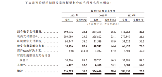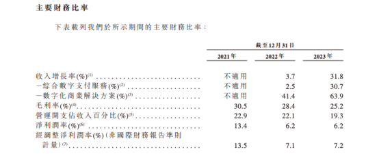此外,富友支付的毛利率从2021年的30.5%显著滑落至2023年的25.2%,降幅超过5个百分点。对于毛利率下滑一事,官方解释称,主要是由于中国境内的支付服务竞争加剧,境内支付服务的毛利率已经由2022年的23.1%下降至21.1%,随着交易量增加,收单服务的佣金增加,作为加强渠道合作伙伴的定价策略的一部分,公司提高了若干渠道伙伴2023年佣金率。