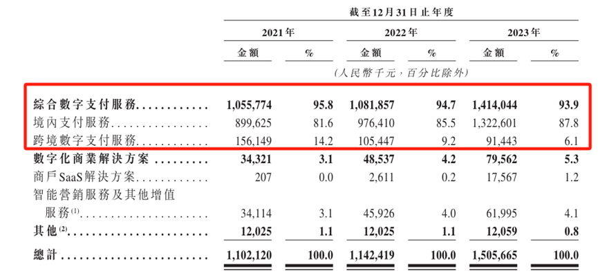 富友支付的境内支付服务主要包括商户收单服务、 信用卡还款服务及基金支付服务。其中,商户收单服务按TPV(总支付交易额)的一定比例向商户收取收单服务费。