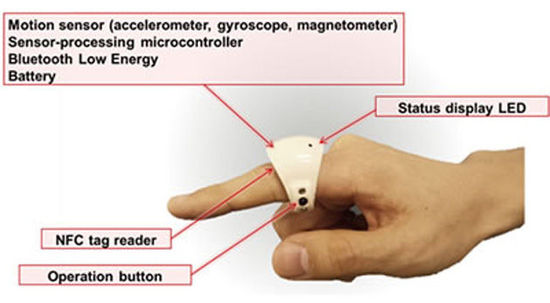 富士通公司表示,“这种戒指型可穿戴设备可以用于输入数字或者在空中用手指记笔记。此外,NFC标签阅读器可以使操作者点击标记对象,显示相关操作和指令的详细信息。”