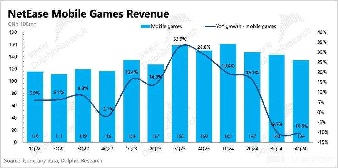 四季度手游又接着下滑了 11%,这个比市场预期要差,市场原本是想着三季度管理层说的《蛋仔》、《逆水寒》流水稳住,再加上《永劫无间》的增量,能够有个放缓的降速。