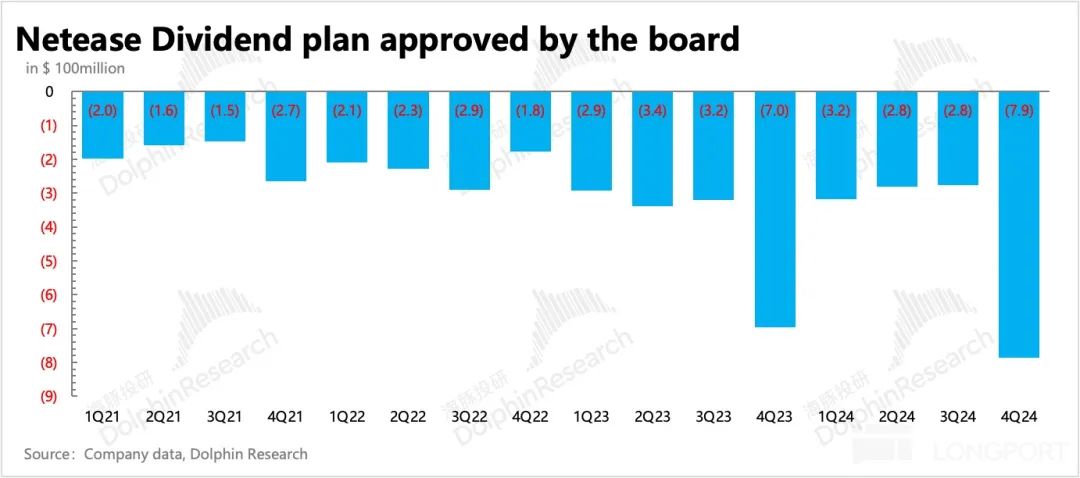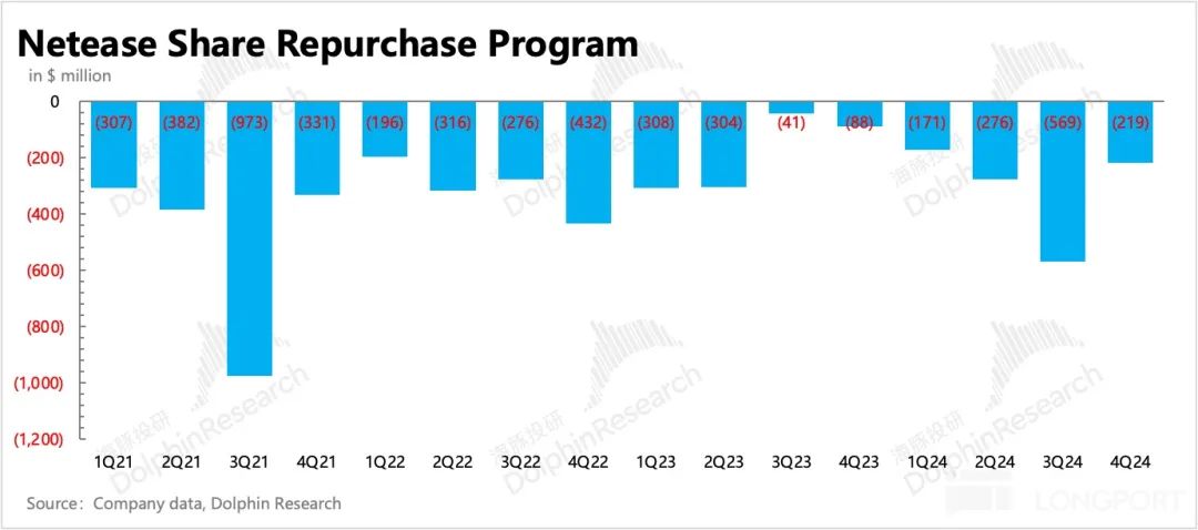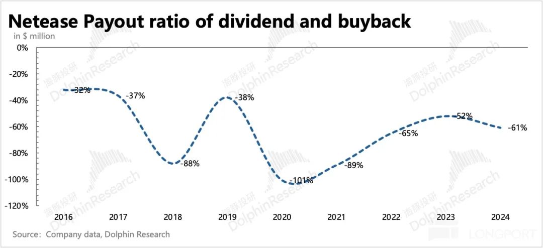 这样海豚君算下来,2024 年网易分红接近 17 亿美金,回购接近 13 亿美金,合计接近 30 亿美金,同比增长了 30%,对应当前股价的回报率大概是 4.5%,不高不低。另外,回购额度还剩下 31 亿美金,有效期也就是剩下一年时间了,意味着要么延长回购期限,要么就会加速回购节奏。