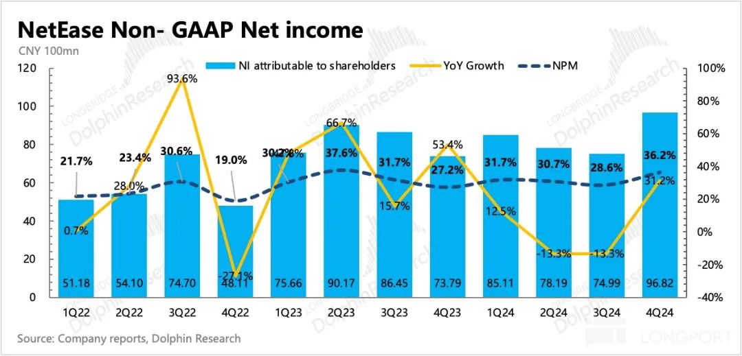 这样海豚君算下来,2024 年网易分红接近 17 亿美金,回购接近 13 亿美金,合计接近 30 亿美金,同比增长了 30%,回购 + 股利整体的 payout ratio 在 60%。对应当前 665 亿市值的回报率大概是 4.5%,不高不低。另外,回购额度还剩下 31 亿美金,有效期也就是剩下一年时间了,意味着要么延长回购期限,要么就会加速回购节奏。