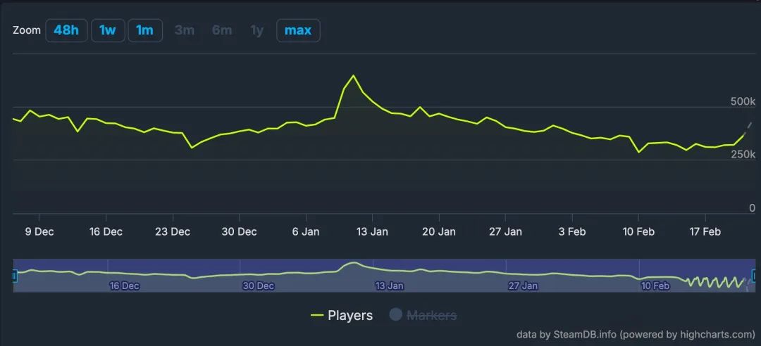 四季度端游中,老游戏《梦幻西游》已经稳定,增量里面,暴雪国服回归占了大头,其次就是 12 月上线后快速爆火的《漫威争锋》。《漫威争锋》一上线,四小时内就登上了 Steam 畅销榜首,三天内吸引了 1000 多万玩家,至今累计超过 4000 万玩家。1 月初赛季开启,又是造出了一个在线玩家数小高峰。以 2 月 21 日情况为例,单日在线玩家数高峰值 44 万,Steam 排行榜第三。