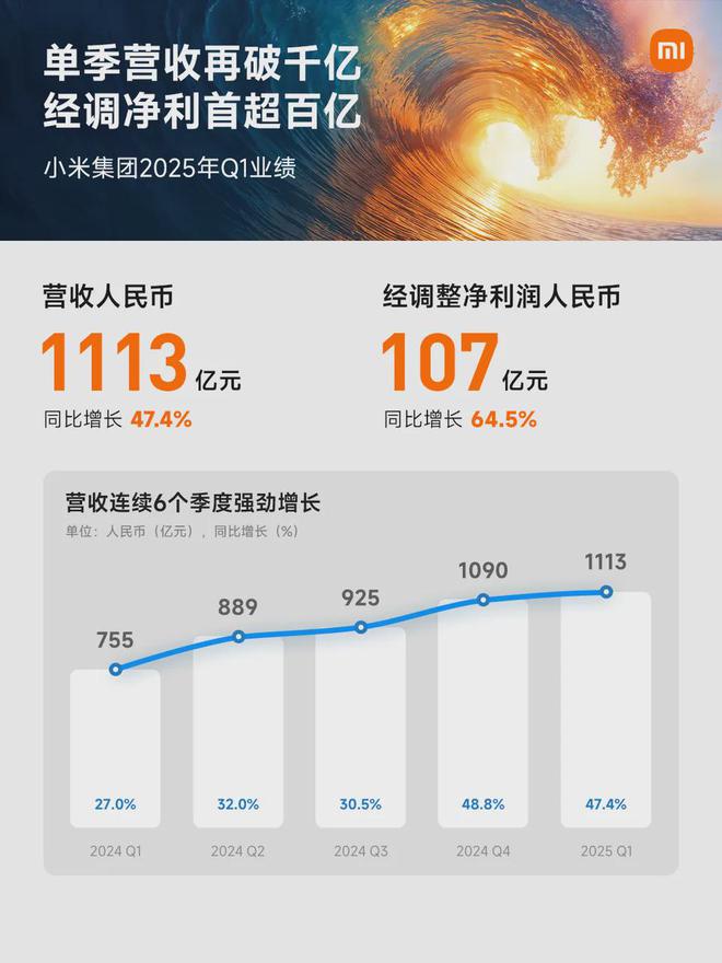 2025年第一季度,小米集团实现总营收1113亿元,同比增长47.4%;经调整净利润107亿元,同比增长64.5%,双双刷新历史纪录。