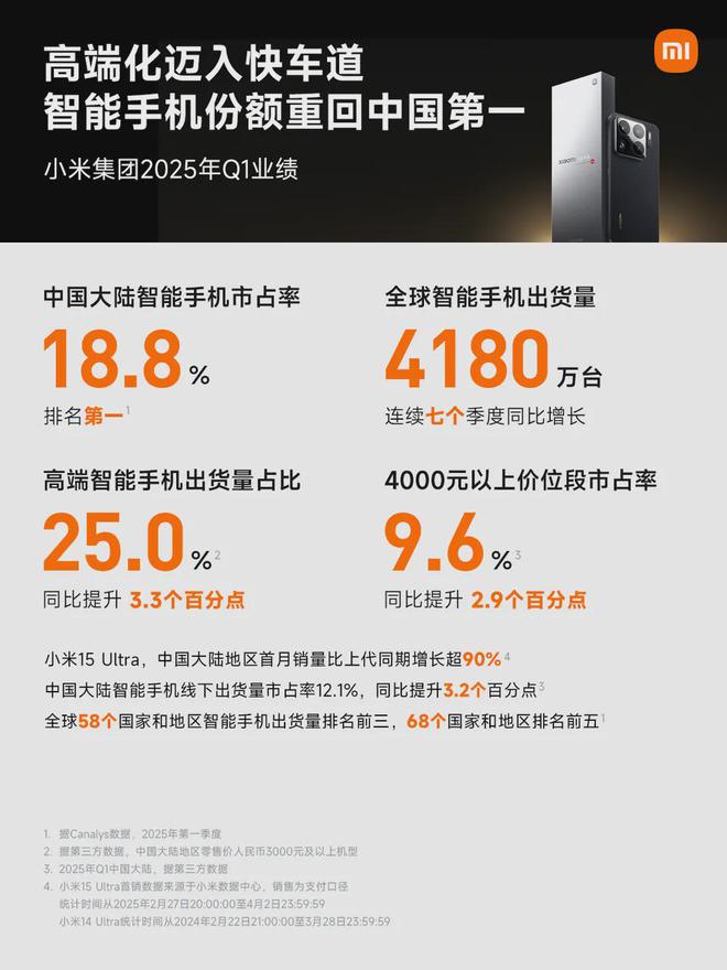 更为关键的是,小米智能手机的高端化战略已初见成效。在中国大陆高端市场份额达到25.0%,尤其是5000至6000元价位蝉联市场第一。