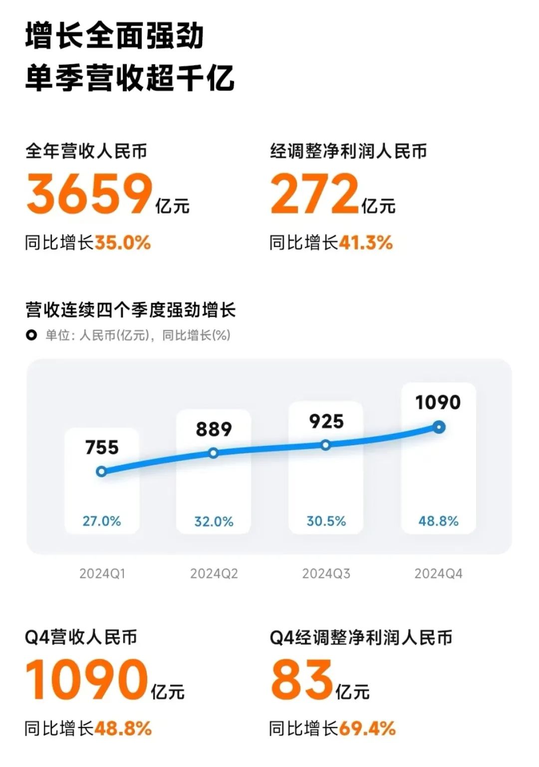 2024年全年,小米净利润为236亿元,同比增长34.9%。经调整净利润为272亿元,创历史新高,同比增长41.3%。