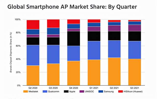 紫光展锐被外界看成是下一个华为,是因为它接过了国产品牌全球手机处理器的市场上的接力棒;同时与华为海思一样紫光展锐也具备基带芯片的设计能力。根据counterpoint数据,2021年第三季度全球蜂窝物联网芯片市场上,紫光展锐以26.8%的市场份额排名全球第二。