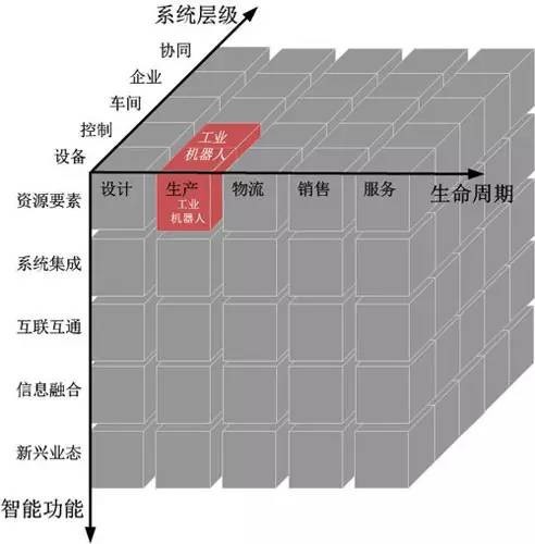 工业机器人位于智能制造系统架构生命周期的生产环节、系统层级的设备层级和控制层级,以及智能功能的资源要素,如图5所示。