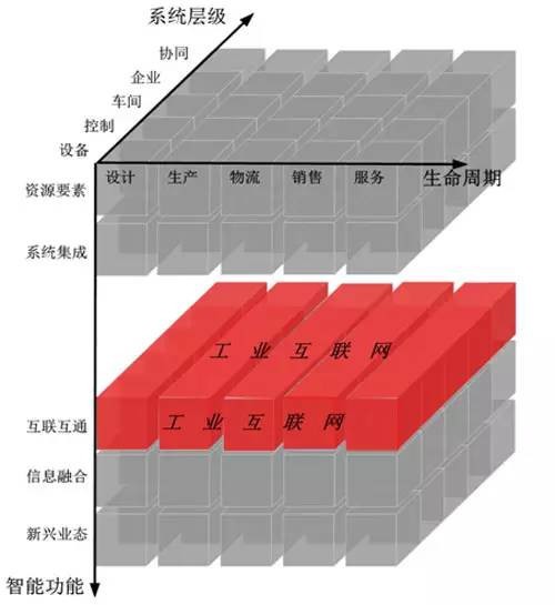 工业互联网位于智能制造系统架构生命周期的所有环节、系统层级的设备、控制、工厂、企业和协同五个层级,以及智能功能的互联互通,如图6所示。