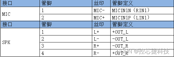 MIC为麦克风接口,SPK为扬声器接口。SPK接口是一个双声道4R/3W的功放电路。
