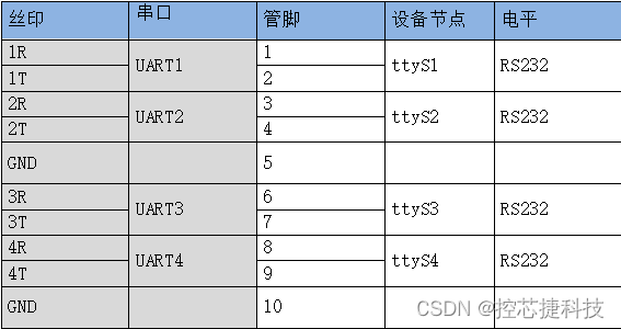 串口定义如下表所示:注:UART2串口是调试接口,在启动时会有打印信息出现,开机后可作为普通串口使用。