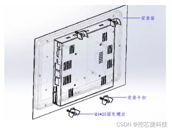 选配安装方式:屏安装面需要开孔,开孔略大于后罩尺寸160*153mm,留好间隙并预留避让天线座空间(天线长度10mm)。安装时用螺丝刀拧紧螺丝,螺丝顶到安装面,螺丝顶死即可。
