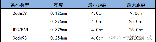 以上数据实验室环境( 250lux) 测量得出, 最小距离取决于符号长度和扫描角度,请结合实际应用环境做调整。