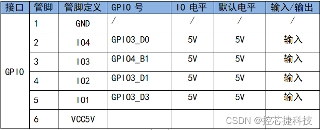 GPIO 采用 HX25037-6WAP 接插件,可提供 5V 供电,可选配输出