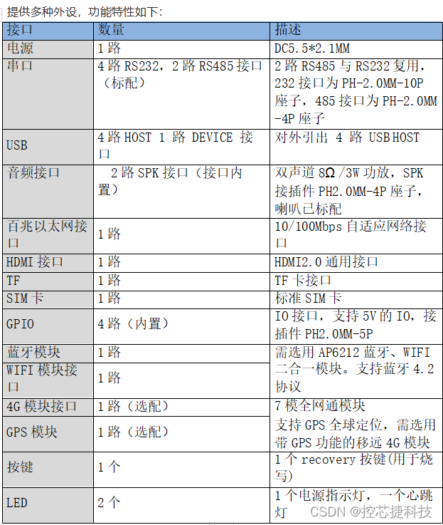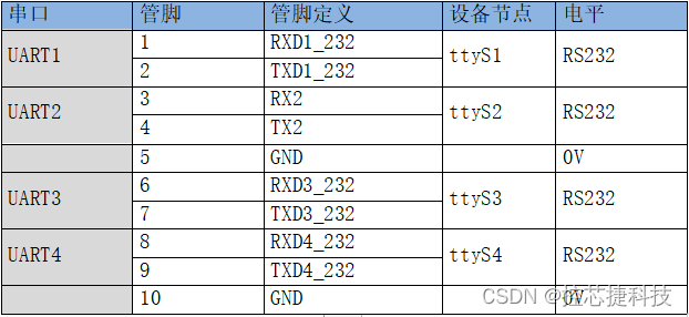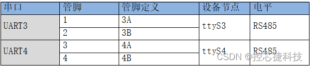 另外 UART3、UART4 是 RS232 与 RS485 硬件复用(UART3、UART4 要么用于RS232,要么用于 RS485,两者不可同时使用)。串口定义如下表所示:注:UART2 串口是调试接 口,在启动时会有打印信息出现,开机后可作为普通串口使用。