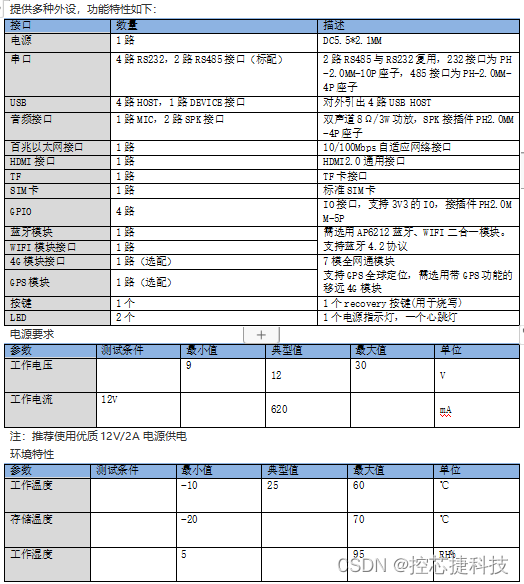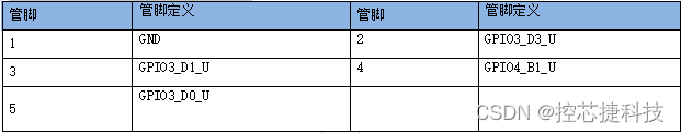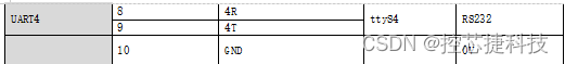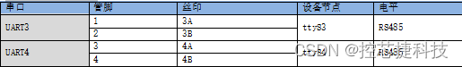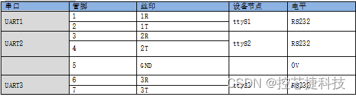 UART1、UART2、UART3、UART4这4路均经过RS232电平转换,做过防静电处理。另外UART3、UART4是RS232与RS485硬件复用(UART3、UART4要么用于RS232,要么用于RS485,两者不可同时使用)。串口定义如下表所示:注:UART2串口是调试接口,在启动时会有打印信息出现,开机后可作为普通串口使用。