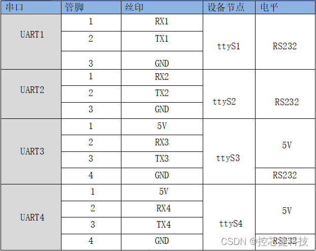 UART1、 UART2、 UART3、 UART4 这 4 路均经过 RS232 电平转换,做过防静电处理。另外 UART4 是 RS232 与 RS485 硬件复用( UART4 用于 RS232 或 RS485 ,两者不可同时使用)。