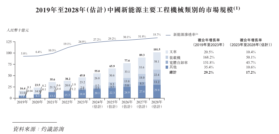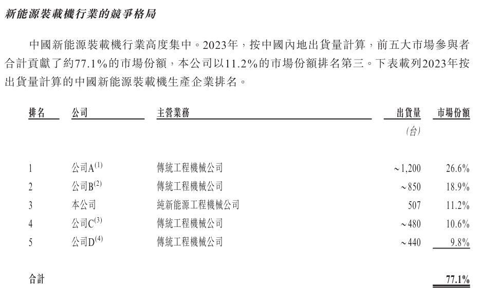 另据灼识咨询数据,按2023年出货量计,博雷顿在我国新能源装载机和新能源宽体自卸车市场分别占据11.2%和8.3%的市场份额,排名分别为第三和第四。