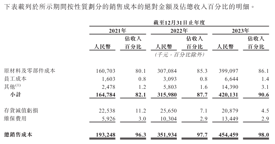 招股书显示,2021-2023年,博雷顿的原材料及零部件成本分别为1.61亿元、3.07亿元、3.99亿元,分别占总营收的80.1%、85.3%、86.1%。