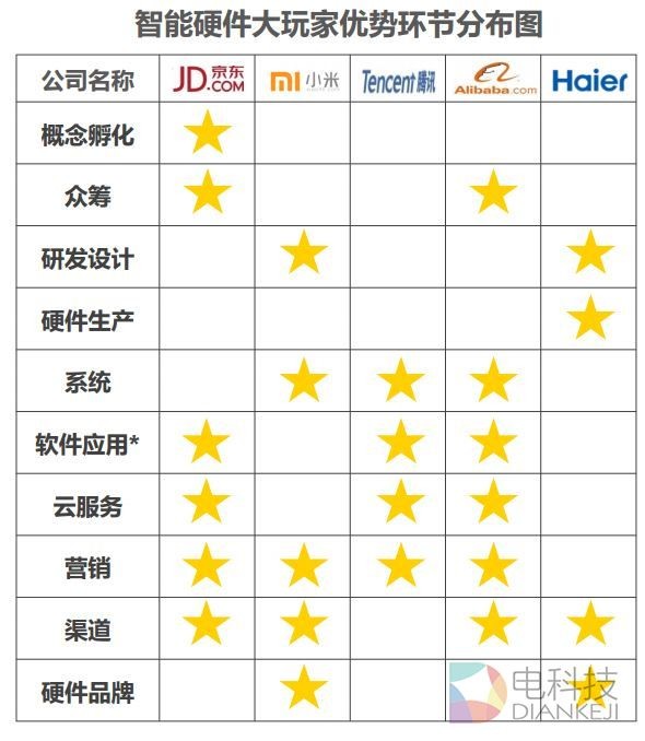 虽同属第一大阵营,BAT、京东、小米、360等几大互联网玩家的布局也各有侧重。艾瑞的报告从孵化、渠道等几个方面对国内智能硬件领域的几大玩家进行了评价。