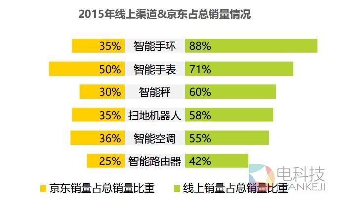 在整个智能硬件行业,大玩家扮演了类似于搭台子的角色。一个是孕育产品的台子,一个是呈现产品的台子。前者可以视为帮助创业者对接资本和产业链各个环节的孵化功能,后者则为对接产品和消费者的营销模式。京东是为数不多的搭了这样两个台子的互联网企业。一方面通过JD+计划为智能硬件创业企业提供全方位的扶持,另一方面通过京东众筹和京东商城两大渠道对产品进行有力的推广。后者为智能硬件新品提供了难得的C端切入点。据艾瑞数据显示,线上渠道已经成为智能硬件销售的主要渠道,其中京东占三成左右。这与智能硬件用户画像和京东消费者之间的契合有一定关系。