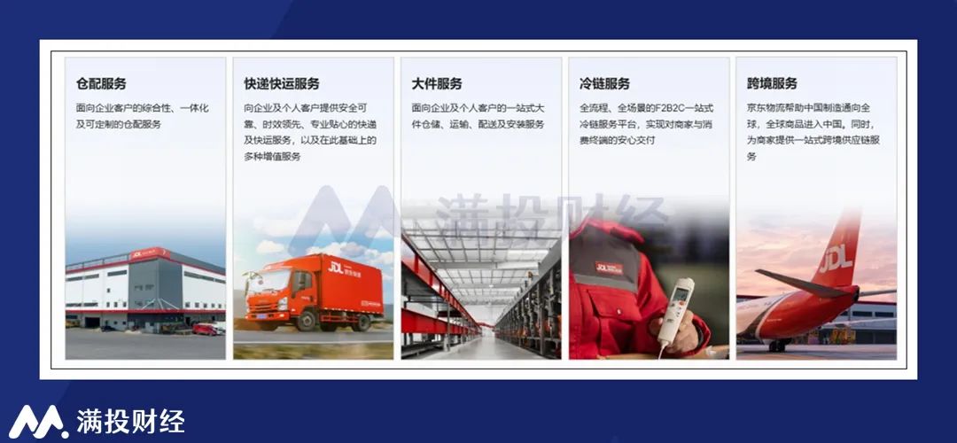 具体的物流服务来看,根据官网的介绍,京东物流主要提供仓配服务、快递服务、快运服务、大件服务、冷链服务、跨境服务六大物流服务。其中快递服务是京东物流向企业及个人客户提供门对门的寄递服务,包括时效件、经济件等多样包裹交付,是京东物流事业部门成立之初,就依托电商件配送最先发展起来的业务。