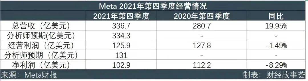 财报显示,Meta四季度营收336.7亿美元,同比2020年同期增长19.95%,高于Yahoo Finance中分析师预期的334.3亿美元。