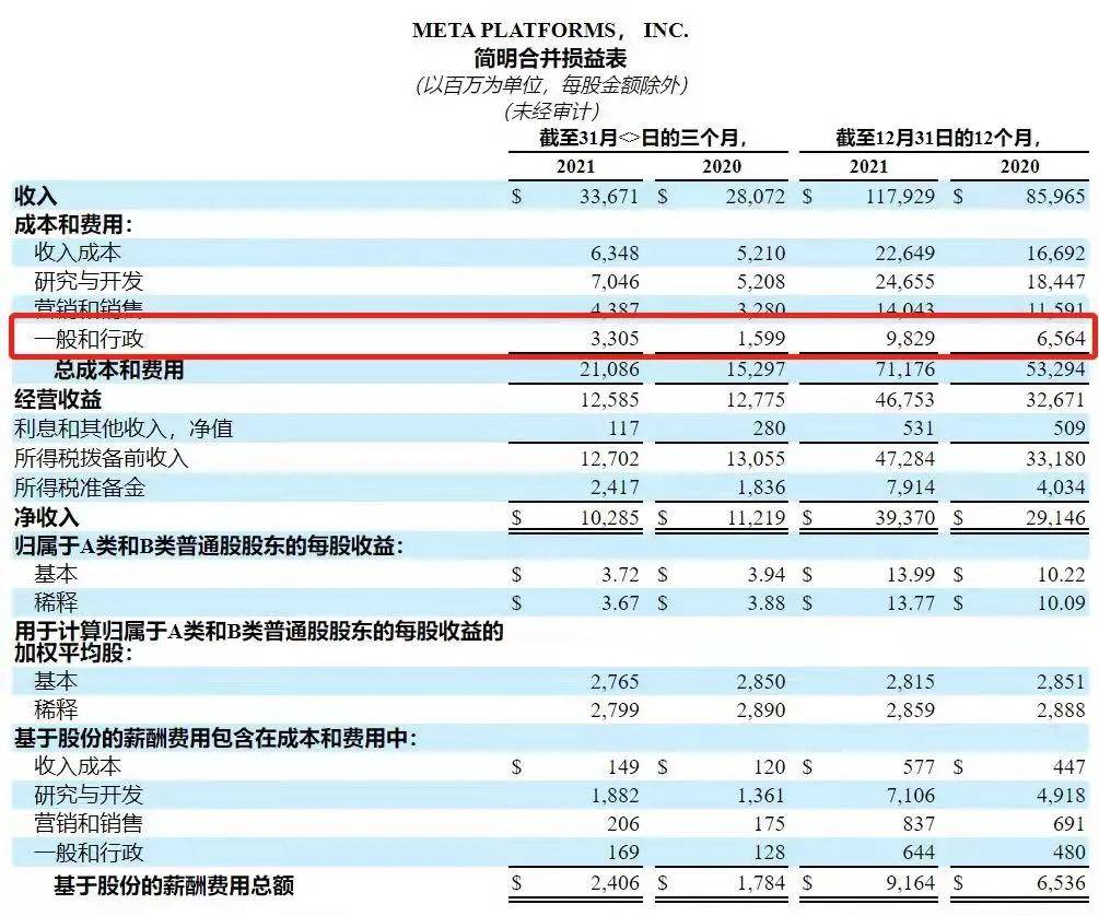 综上,“一般和行政费用”是2021年第四季度影响Meta利润的重要因素,其主要包括法律相关费用和行政人员增加费用,根据财报,2021Q4大部分一般和行政费用属于法务费用,如与法律相关的应计费用和一般结算成本以及管理费用,其属于与公司经营业务关联较小的费用。