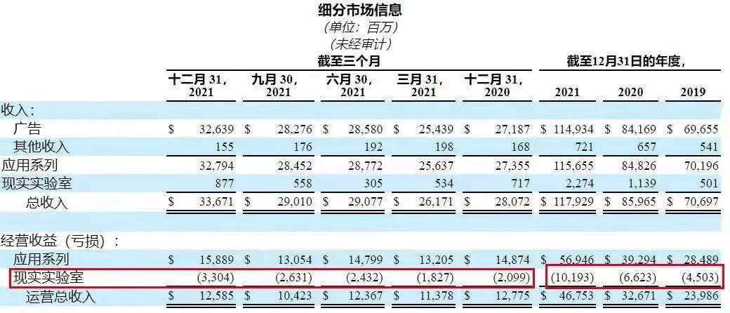 已经迈进新旧业务交接的临界点,应用程序家族虽然营收占主导,但Meta逐渐加强对营收占比小的现实实验室投入,包括硬件成本、核心基础架构投资和向合作伙伴的付款,巨资投入导致现实实验室业务入不敷出,越赚越亏:2021Q4亏损33.4亿美元;一年比一年亏得多,从2019年亏损45亿美元到2021年亏损超过100亿美元。