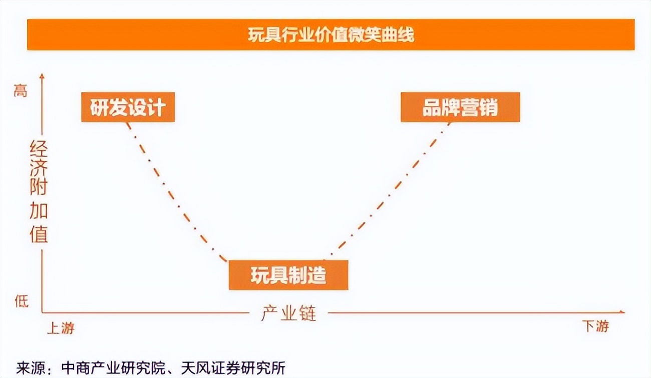 根据中商产业研究院、天风证券研究所信息披露,玩具行业产业链主要包括研发设计、生产制造、品牌营销三大环节,其中生产制造是低附加值环节,而研发设计、品牌营销均属于高附加值环节。