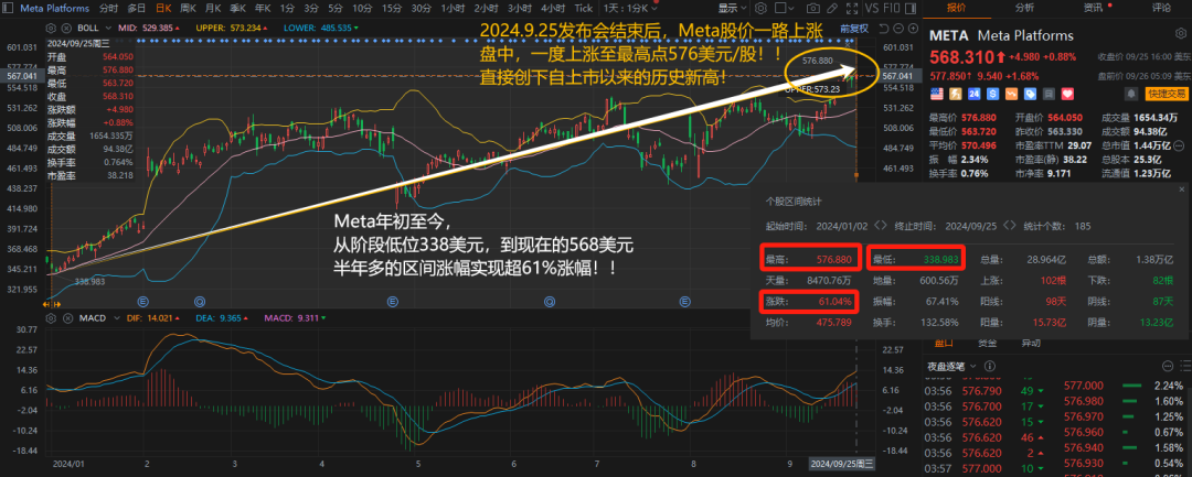 这次的发布会结束后,Meta股价一路上涨,盘中一度上涨至最高点576美元/股。创下自上市以来的历史新高!