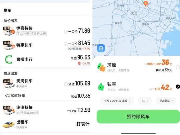潘哥在滴滴App上,测试相同的一段路程,发现快车费用为105元,而顺风车独享为42元、单人拼座36元。